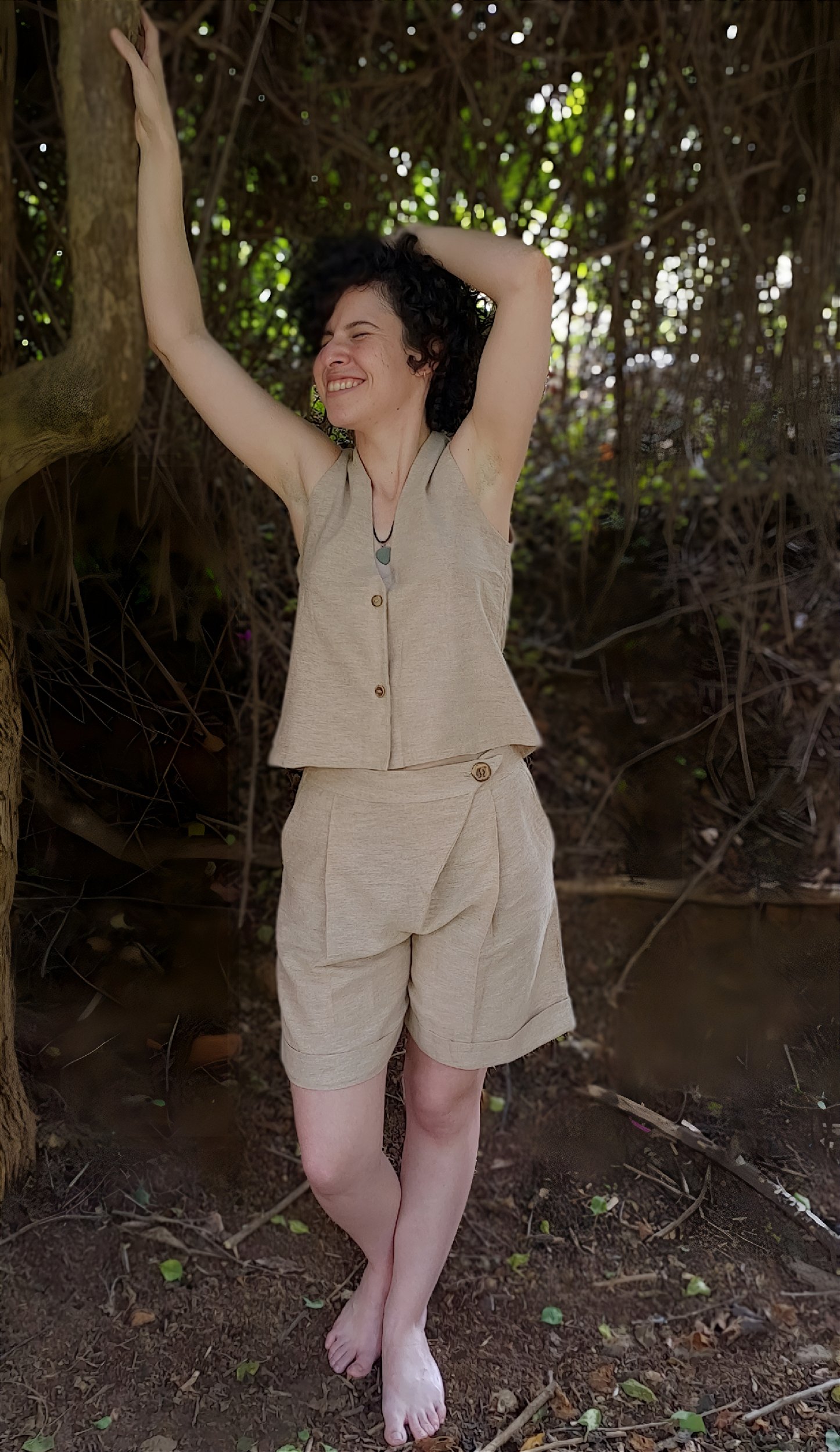 Bermuda Areia - Bermuda feita em tecido mesclado 72% Algodão Orgânico e 28% Fibras Naturais Recicladas, naturalmente colorido no tom de areia, ou seja, não precisa de tingimento, economizando água e não gerando poluentes. Costurada com linhas e fios 100% Algodão, modelagem solta, com fechamento frontal em um cós assimétrico com botão de coco natural, pregas frontais e quatro bolsos, dois laterais e dois traseiros, uma peça elegante, confortável e totalmente biodegradável.