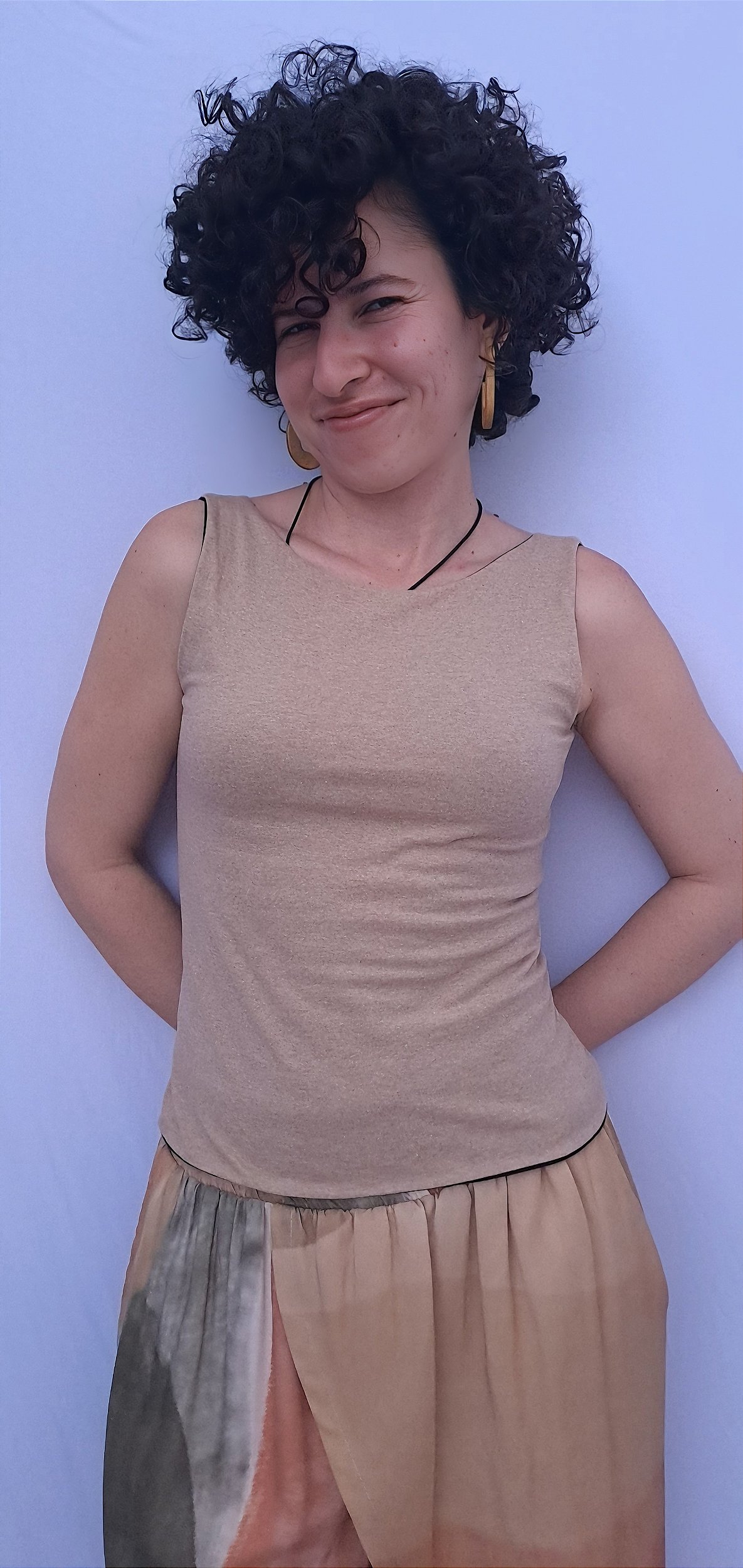 Regata Dupla face Folha - Regata dupla face, com modelagem justa no corpo, decote canoa na frente e decote profundo nas costas, o lado Bege é feito de malha 100% Algodão Orgânico, e o lado preto é feito de malha viscolycra, 91% vicose e 9% elastano, por serem duas malhas, a peça se estica e se ajusta ao corpo.
