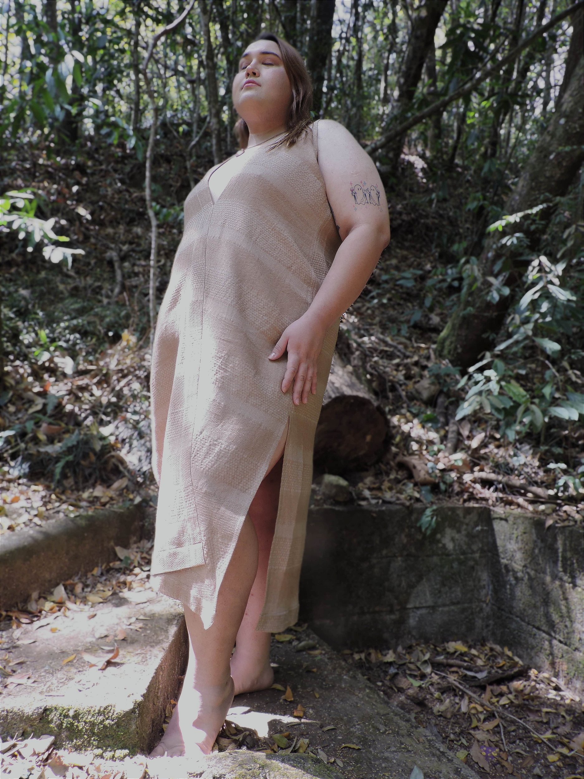 Túnica Húmus - Túnica feita em tecido 100% Algodão Orgânico Maquinetado, o que significa que o tecido é construído já com padronagens em sua trama, mesclando os tons cru e marrom naturalmente coloridos, ou seja, não precisam de tingimento, economizando água e não gerando poluentes. Costurada com linhas e fios 100% algodão cru, altura midi, com decote V formado por transpasse fixo na frente e fendas laterais, é uma peça confortável, fresca e com um visual único, além de tudo, totalmente biodegradável.